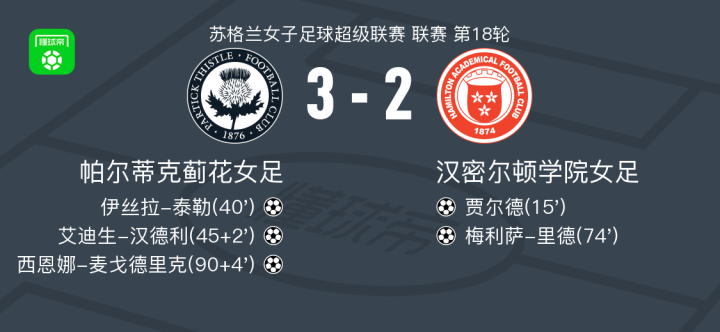 北京时间2月23日苏格兰女子足球超级联赛 联赛 第18轮,帕尔蒂克蓟花女足主场对阵汉密尔顿学院女足。帕尔蒂克蓟花女足伊丝拉-泰勒破门,艾迪生-汉德利破门,西恩娜-麦戈德里克破门。汉密尔顿学院女足贾尔德破门,梅利萨-里德破门。最终比分帕尔蒂克蓟花女足 3-2 汉密尔顿学院女足。
