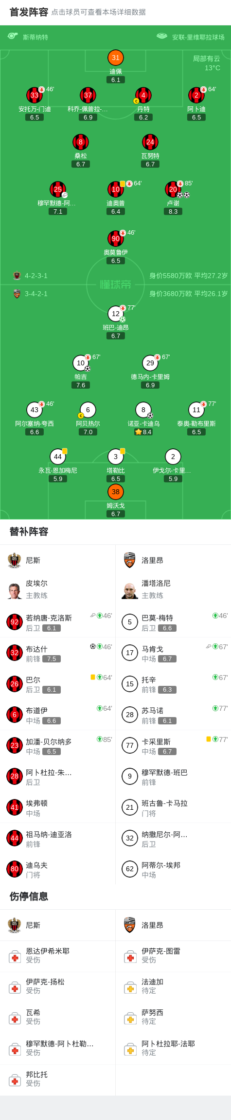 尼斯3-3洛里昂,卢谢先拔头筹,诺亚-卡迪乌扳平