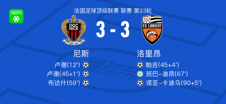 北京时间2月23日法国足球顶级联赛第23轮,尼斯主场对阵洛里昂。比赛中,尼斯球员卢谢完成梅开二度,布达什打入一球;洛里昂方面,帕吉、班巴-迪昂、诺亚-卡迪乌先后建功。最终两队战成3-3平。