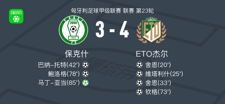 北京时间2月23日匈牙利足球甲级联赛 联赛 第23轮,保克什主场对阵ETO杰尔。保克什巴纳-托特破门,鲍洛格破门,马丁-亚当破门。ETO杰尔舍恩梅开二度,维塔利什破门,钦格破门。最终比分保克什 3-4 ETO杰尔。