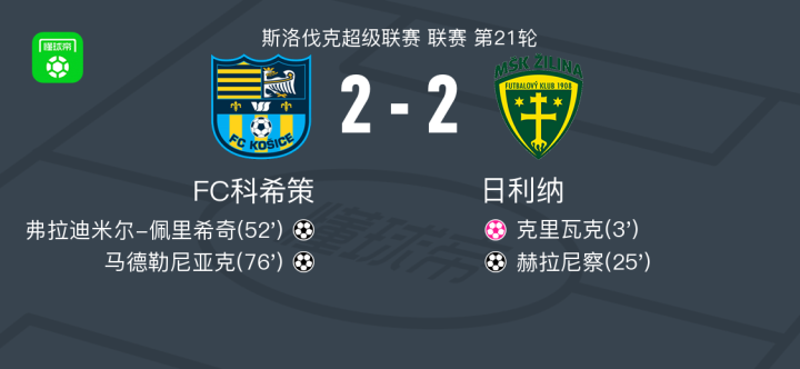 北京时间2月23日斯洛伐克超级联赛 联赛 第21轮,FC科希策主场对阵日利纳。FC科希策弗拉迪米尔-佩里希奇破门,马德勒尼亚克破门,克里瓦克自摆乌龙。日利纳赫拉尼察破门。最终比分FC科希策 2-2 日利纳。