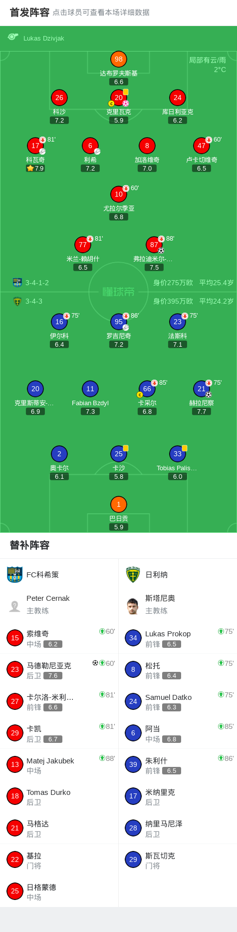 第25分钟,日利纳球员罗吉尼奇助攻赫拉尼察打入一球。