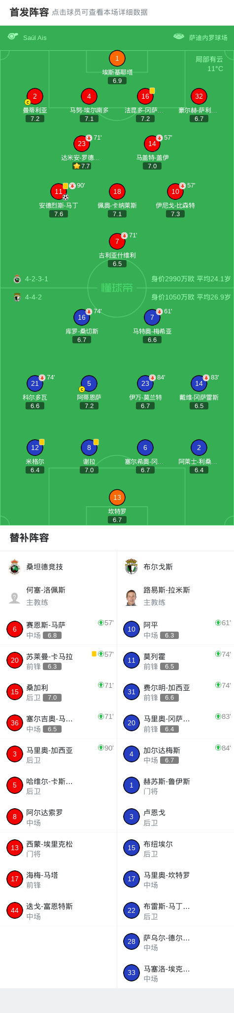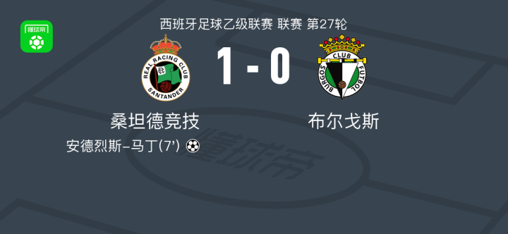 桑坦德竞技1-0布尔戈斯,安德烈斯-马丁助球队取胜战报bot @懂球帝02-23 03:26北京时间2月23日西班牙足球乙级联赛 联赛 第27轮,桑坦德竞技主场对阵布尔戈斯。桑坦德竞技安德烈斯-马丁破门。最终比分桑坦德竞技 1-0 布尔戈斯。点击查看本场比赛详细数据>>点击查看西乙完整积分榜>>精彩瞬间第7分钟,桑坦德竞技球员安德烈斯-马丁打入一球。 球队阵容 技术统计 展开更多