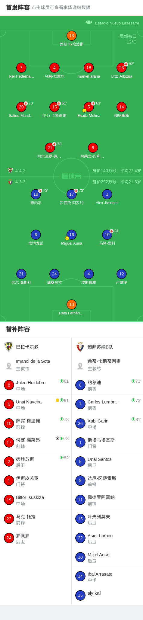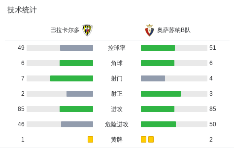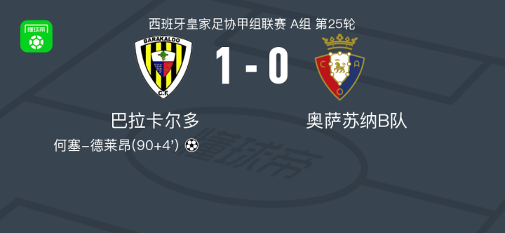 巴拉卡度1-0奥萨苏纳B队,何塞-德莱昂助球队取胜战报bot @懂球帝02-23 03:29北京时间2月23日西班牙皇家足协甲组联赛 A组 第25轮,巴拉卡尔多主场对阵奥萨苏纳B队。巴拉卡尔多何塞-德莱昂破门。最终比分巴拉卡度 1-0 奥萨苏纳B队。点击查看本场比赛详细数据>>点击查看西协甲完整积分榜>>精彩瞬间下半场补时第4分钟,巴拉卡尔多球员何塞-德莱昂打入一球。 球队阵容 技术统计 展开更多