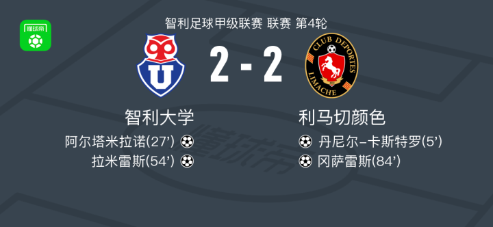 北京时间2月23日智利足球甲级联赛 联赛 第4轮,智利大学主场对阵利马切颜色。智利大学阿尔塔米拉诺破门,拉米雷斯破门。利马切颜色丹尼尔-卡斯特罗破门,冈萨雷斯破门。最终比分智利大学 2-2 利马切颜色。