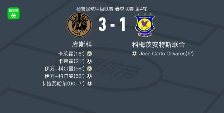 北京时间2月23日秘鲁足球甲级联赛 春季联赛 第4轮,库斯科主场对阵科梅茨安特斯联合。库斯科卡莱霍破门,伊万-科尔曼破门,卡拉瓦哈尔破门。科梅茨安特斯联合Jean Carlo Olivares破门。最终比分库斯科 3-1 科梅茨安特斯联合。