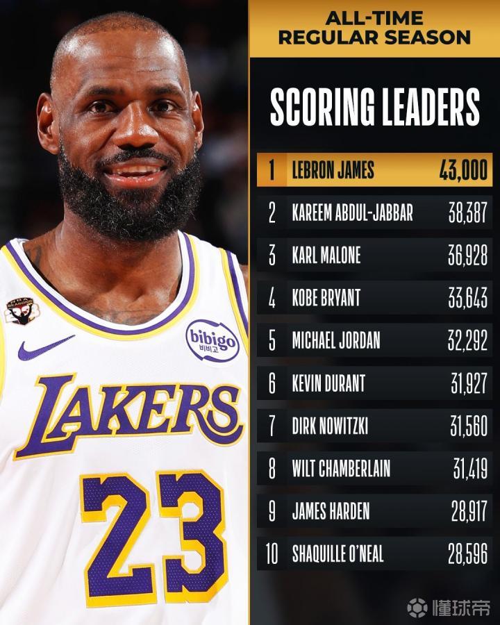前无古人,詹姆斯常规赛总得分正式突破43000分大关