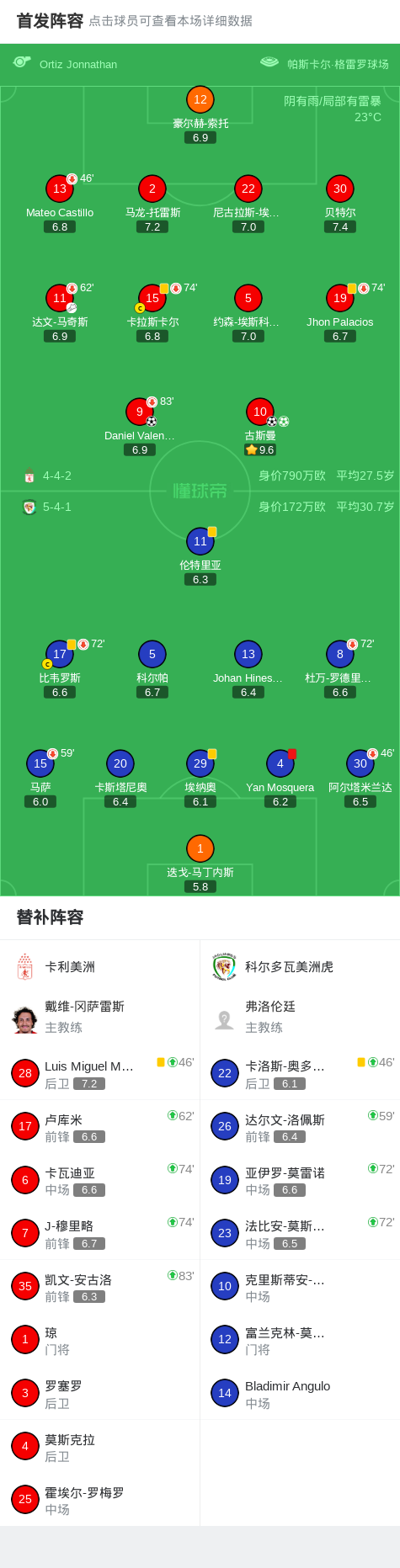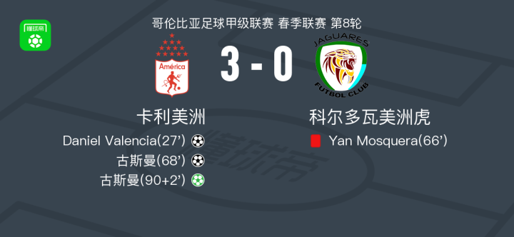 卡利美洲3-0大胜科尔多瓦美洲虎,古斯曼两球,Daniel Valencia建功