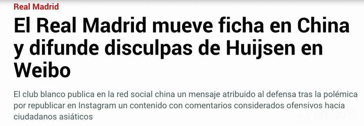 马卡与世体报道了赫伊森转发辱华内容的事件,并写道:“皇家马德里俱乐部在其官方微博账号上发表了声明,该账号主要面向中国用户,这条微博引发了中国球迷的强烈批评,他们质疑道歉的诚意,并要求俱乐部在国际平台上发表公开声明或发布视频,而不仅仅是一份书面声明。”同时,两家媒体也介绍,皇马在2024年也曾卷入此类事件。