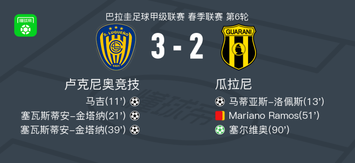 北京时间2月23日巴拉圭足球甲级联赛 春季联赛 第6轮,卢克尼奥竞技主场对阵瓜拉尼。卢克尼奥竞技马吉破门,塞瓦斯蒂安-金塔纳梅开二度。瓜拉尼马蒂亚斯-洛佩斯破门,塞尔维奥破门。最终比分卢克尼奥竞技 3-2 瓜拉尼。