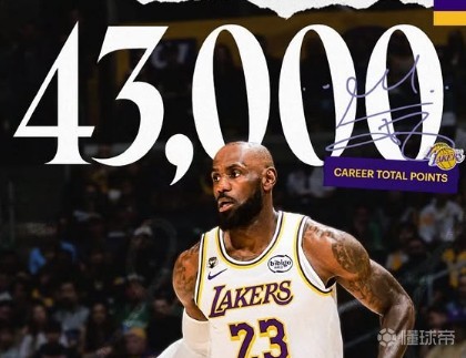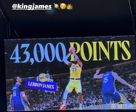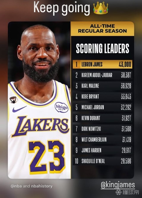 詹姆斯社媒转发43000分里程碑海报:继续前进Aphelios19 @懂球帝02-23 22:122月23日,湖人球星勒布朗-詹姆斯达成职业生涯43000分里程碑。赛后他也转发了自己得到43000分的海报,并配文:“继续前进。”在2023年2月7日湖人对阵雷霆的比赛中,他砍下38分,超越卡里姆-阿卜杜勒-贾巴尔,登上常规赛生涯得分榜榜首。詹姆斯在2025年12月30日年满41岁,目前独自一人高居历史得分榜榜首。展开更多