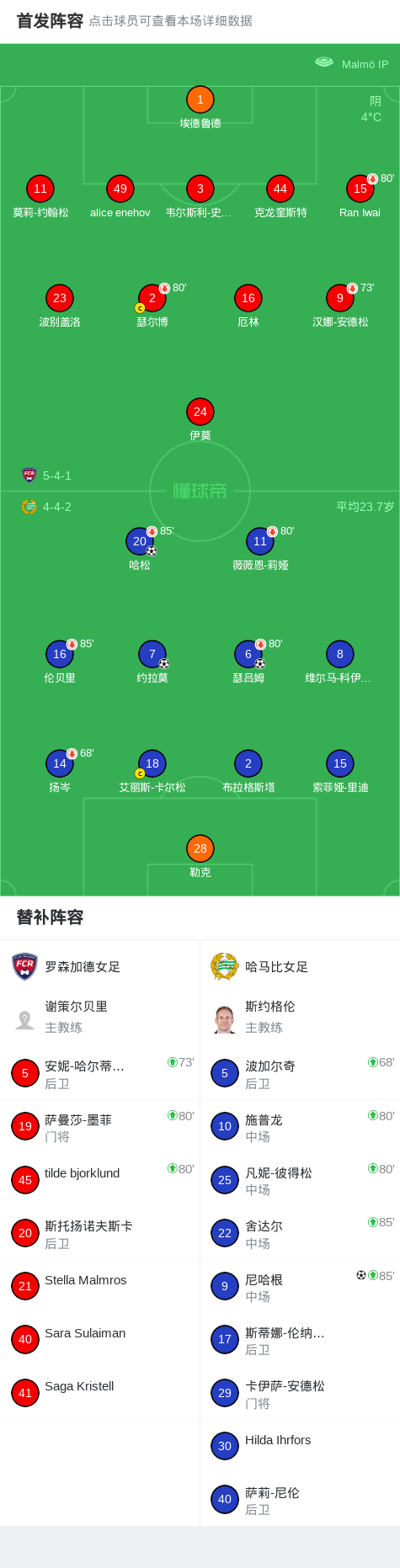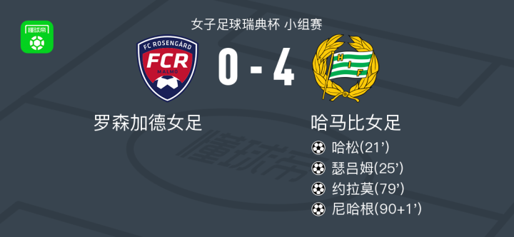 北京时间2月24日女子足球瑞典杯 小组赛,罗森加德女足对阵哈马比女足。哈马比女足哈松破门,瑟吕姆破门,约拉莫破门,尼哈根破门。最终比分罗森加德女足 0-4 哈马比女足。