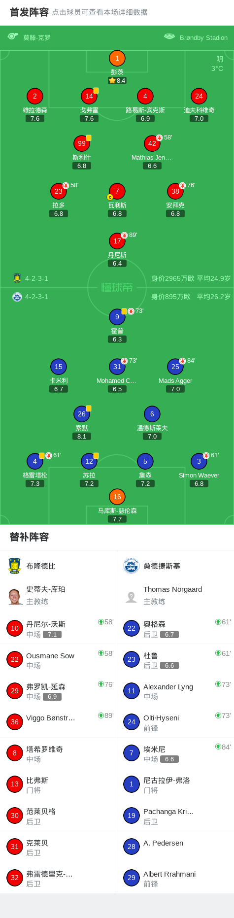 布隆德比0-0桑德捷斯基,双方互交白卷战报bot @懂球帝02-24 03:57北京时间2月24日丹麦足球超级联赛 联赛 第21轮,布隆德比主场对阵桑德捷斯基。最终比分布隆德比 0-0 桑德捷斯基。点击查看本场比赛详细数据>>点击查看丹超完整积分榜>> 球队阵容 技术统计 展开更多