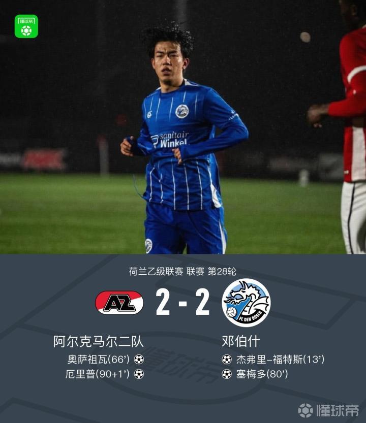 阿尔克马尔二队2-2邓伯什,王博豪88分钟替补出场,厄里普绝平