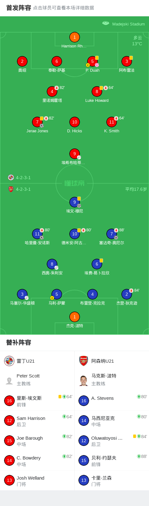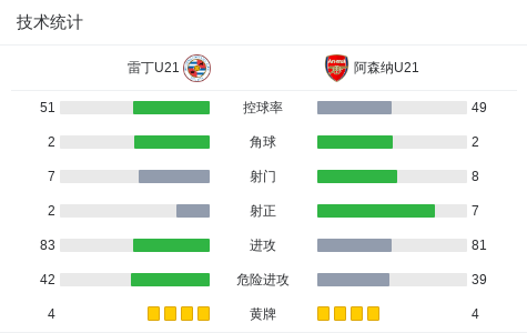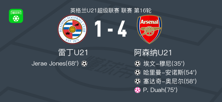 北京时间2月24日英格兰U21超级联赛 联赛 第16轮,雷丁U21主场对阵阿森纳U21。雷丁U21Jerae Jones破门,P. Duah自摆乌龙。阿森纳U21埃文-穆尼破门,哈里曼-安诺斯破门,塞达奇-奥尼尔破门。最终比分雷丁U21 1-4 阿森纳U21。