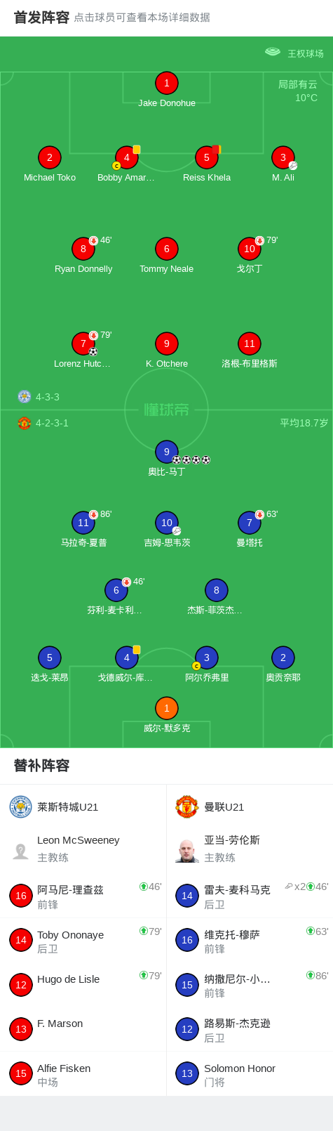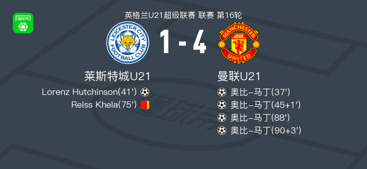 北京时间2月24日英格兰U21超级联赛 联赛 第16轮,莱斯特城U21主场对阵曼联U21。莱斯特城U21Lorenz Hutchinson破门。曼联U21奥比-马丁大四喜。最终比分莱斯特城U21 1-4 曼联U21。