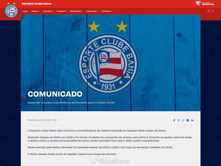 巴西球队巴伊亚(EC Bahia)官方宣布,该队...Asaikana @懂球帝02-24 18:43巴西球队巴伊亚(EC Bahia)官方宣布,该队巴西球员雷森德(Rezende)转会青岛西海岸。雷森德今年31岁,司职后腰。此前一直在巴西国内效力,2022年加盟巴西巴伊亚队,至今为该队出场了160次,打进9球。*此前德转依据巴西媒体报道将该球员转会费录入为100万欧元,经与巴西方面核实后已更正为自由转会(巴媒原错误报道亦已删除),周知。展开更多
