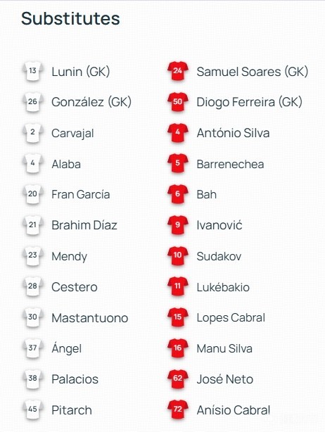 替补:13-卢宁、26-弗兰-冈萨雷斯、2-卡瓦哈尔、4-阿拉巴、20-弗兰-加西亚、21-卜拉欣-迪亚斯、23-费兰-门迪、28-塞斯特罗、30-马斯坦托诺、37-安赫尔、38-塞萨尔-帕拉西奥斯、45-皮塔奇