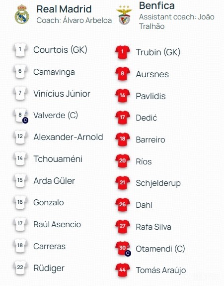 皇马首发:1-库尔图瓦、12-阿诺德、17-劳尔-阿森西奥、22-吕迪格、18-卡雷拉斯、8-巴尔韦德、15-居莱尔、14-楚阿梅尼、6-卡马文加、16-贡萨洛、7-维尼修斯