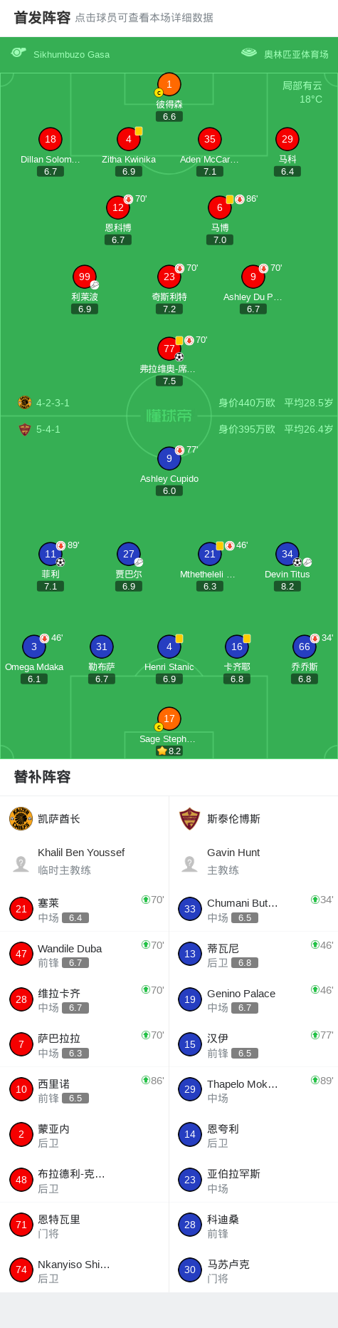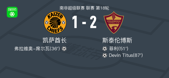 北京时间2月25日南非超级联赛 联赛 第18轮,凯萨酋长主场对阵斯泰伦博斯。凯萨酋长弗拉维奥-席尔瓦破门。斯泰伦博斯菲利破门,Devin Titus破门。最终比分凯萨酋长 1-2 斯泰伦博斯。