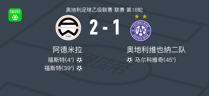 北京时间2月25日奥地利足球乙级联赛 联赛 第18轮,阿德米拉主场对阵奥地利维也纳二队。阿德米拉福斯特梅开二度。奥地利维也纳二队马尔科维奇破门。最终比分阿德米拉 2-1 奥地利维也纳B队。