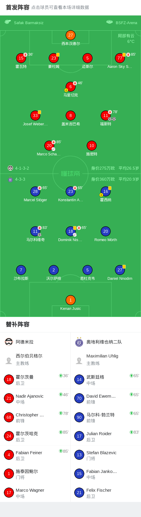 第45分钟,奥地利维也纳二队球员Dominik Nisandzic助攻马尔科维奇打入一球。
