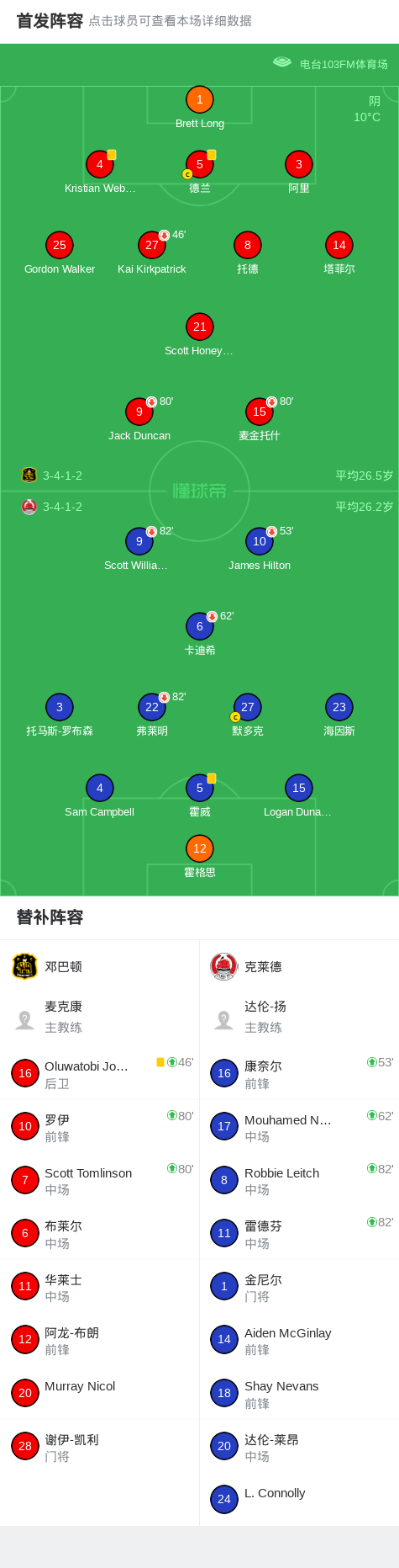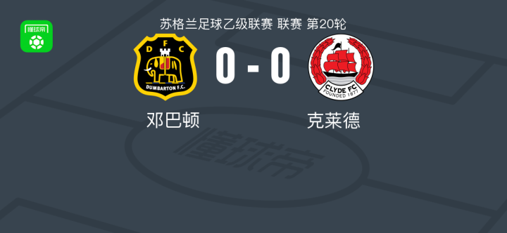 邓巴顿0-0克莱德,双方握手言和战报bot @懂球帝02-25 05:49北京时间2月25日苏格兰足球乙级联赛 联赛 第20轮,邓巴顿主场对阵克莱德。最终比分邓巴顿 0-0 克莱德。点击查看本场比赛详细数据>> 球队阵容 技术统计 展开更多