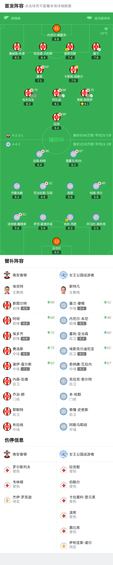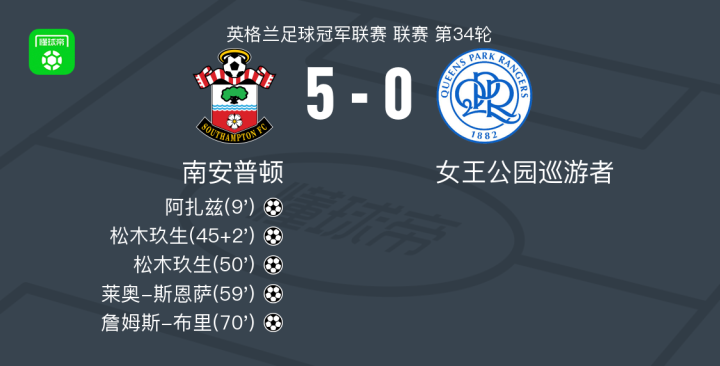 北京时间2月25日英格兰足球冠军联赛 联赛 第34轮,南安普顿主场对阵女王公园巡游者。南安普顿阿扎兹破门,松木玖生梅开二度,莱奥-斯恩萨破门,詹姆斯-布里破门。最终比分南安普顿 5-0 女王公园巡游者。