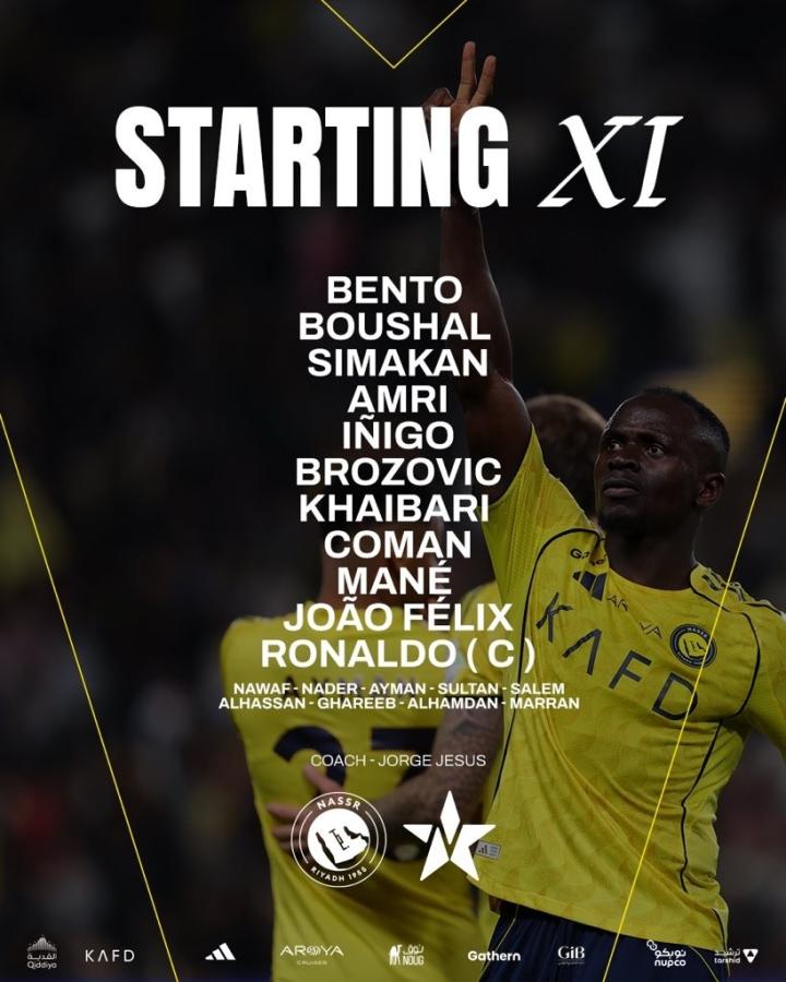 利雅得胜利首发:24-本托、12-纳瓦夫-布歇尔、3-西马坎、5-阿卜杜拉-阿姆里、26-伊尼戈-马丁内斯、17-阿卜杜拉-海巴里、11-布罗佐维奇、21-金斯利-科曼、10-马内、79-菲利克斯、7-C罗