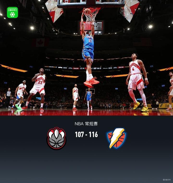 第四节猛龙奎克利拿下8分,雷霆卡森-华莱士拿下7分,最终猛龙107-116不敌雷霆