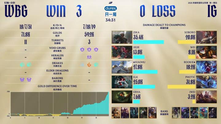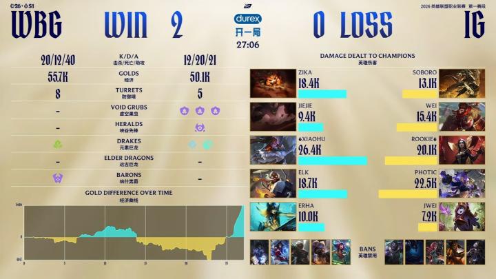 北京时间2月25日,LPL第一赛段淘汰赛首轮,WBG对阵iG。本场比赛的三局游戏iG都打出了有来有回的局面,但第一局大龙决策出错,第二局被Xiaohu兔子五杀收汁,最后一局龙魂刷新前iG又团战犯错,最终被WBG3-0横扫。WBG将在胜者组半决赛等待BLG与NIP的胜者,iG则等待落败方作为败者组对手。
