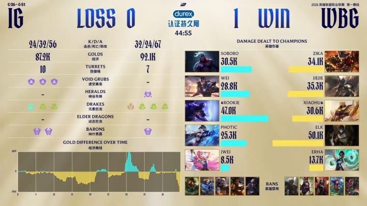 第一局iG选出上单维鲁斯,第21分钟砍下四杀。局势有来有回的情况下,第43分钟,WBG开大龙,iG决策完全昏头,WBG先下一局。