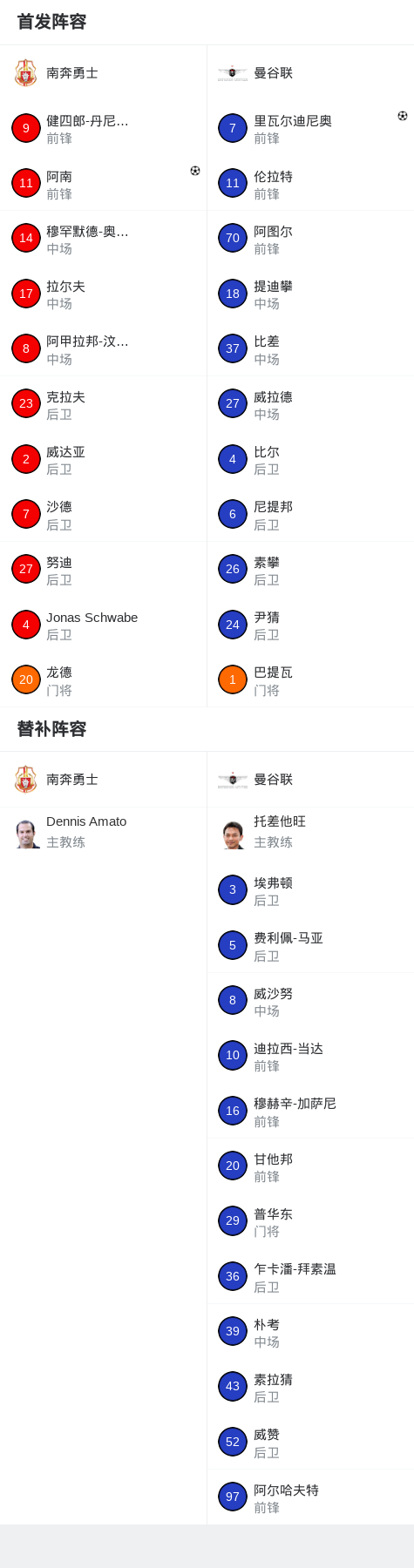 南奔勇士2-1逆转曼谷联,姆拉帕、阿南破门