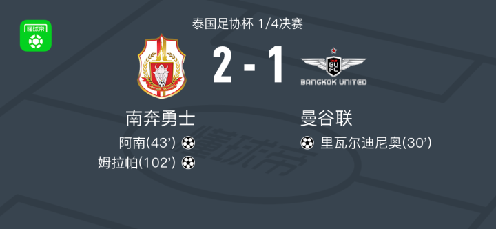 北京时间2月25日泰国足协杯 1/4决赛,南奔勇士对阵曼谷联。南奔勇士阿南破门,姆拉帕破门。曼谷联里瓦尔迪尼奥破门。最终比分南奔勇士 2-1 曼谷联。