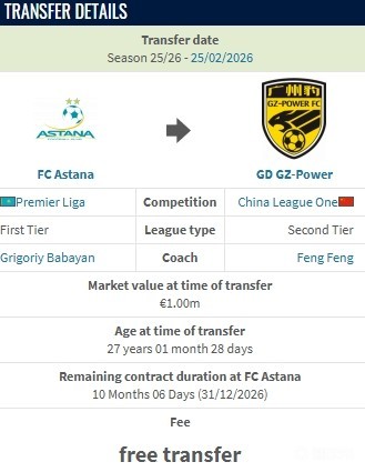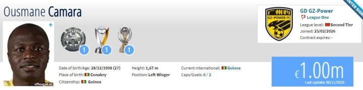 北京时间2月25日,德转更新,阿斯塔纳边锋奥斯曼-卡马拉加盟广东广州豹。此前德转显示转会费为80万欧,后更正为自由转会。