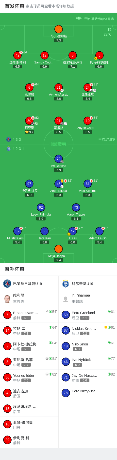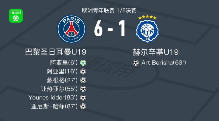 北京时间2月25日欧洲青年联赛 1/8决赛,巴黎圣日耳曼U19对阵赫尔辛基U19。巴黎圣日耳曼U19阿亚里梅开二度,蒙根格破门,让热亚尔破门,Younes Idder破门,亚尼斯-哈菲破门。赫尔辛基U19Art Berisha破门。最终比分巴黎圣日耳曼U19 6-1 赫尔辛基U19。