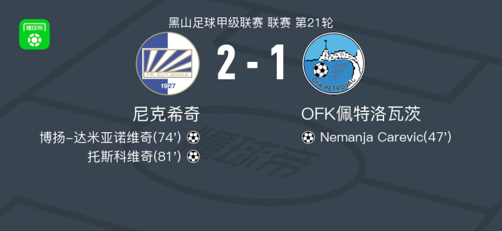 北京时间2月25日黑山足球甲级联赛 联赛 第21轮,尼克希奇主场对阵OFK佩特洛瓦茨。尼克希奇博扬-达米亚诺维奇破门,托斯科维奇破门。OFK佩特洛瓦茨Nemanja Carevic破门。最终比分尼克希奇 2-1 OFK佩特洛瓦茨。