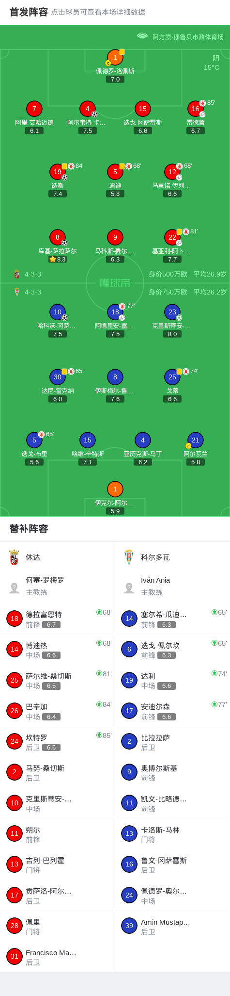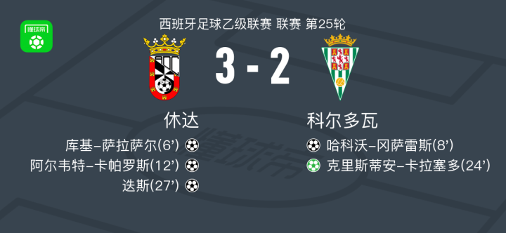 北京时间2月26日西班牙足球乙级联赛 联赛 第25轮,休达主场对阵科尔多瓦。休达库基-萨拉萨尔破门,阿尔韦特-卡帕罗斯破门,迭斯破门。科尔多瓦哈科沃-冈萨雷斯破门,克里斯蒂安-卡拉塞多破门。最终比分休达 3-2 科尔多瓦。