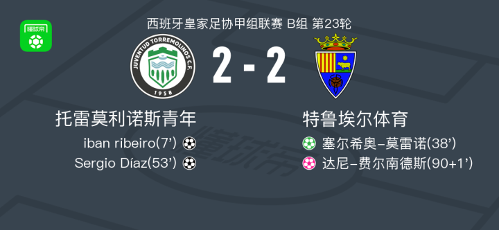 北京时间2月26日西班牙皇家足协甲组联赛 B组 第23轮,托雷莫利诺斯青年主场对阵特鲁埃尔体育。托雷莫利诺斯青年iban ribeiro破门,Sergio Díaz破门,达尼-费尔南德斯自摆乌龙。特鲁埃尔体育塞尔希奥-莫雷诺破门。最终比分托雷莫利诺斯青年 2-2 特鲁埃尔体育。