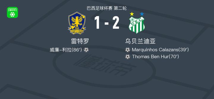 北京时间2月26日巴西足球杯赛 第二轮,雷特罗对阵乌贝兰迪亚。雷特罗威廉-利拉破门。乌贝兰迪亚Marquinhos Calazans破门,Thomas Ben Hur破门。最终比分雷特罗 1-2 乌贝兰迪亚。