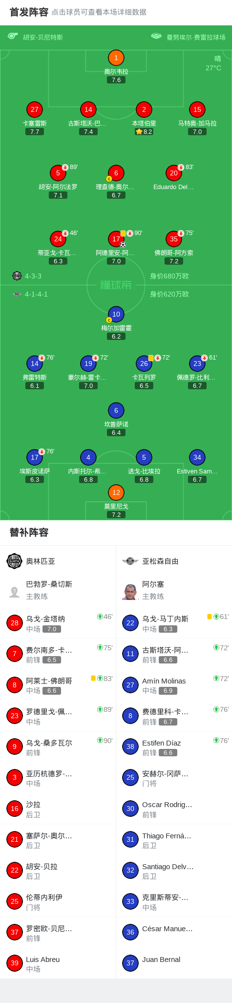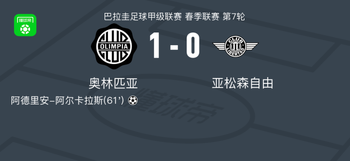 奥林匹亚1-0亚松森自由,阿德里安-阿尔卡拉斯一击制胜战报bot @懂球帝02-26 09:24北京时间2月26日巴拉圭足球甲级联赛 春季联赛 第7轮,奥林匹亚主场对阵亚松森自由。奥林匹亚阿德里安-阿尔卡拉斯破门。最终比分奥林匹亚 1-0 亚松森自由。点击查看本场比赛详细数据>>点击查看巴拉甲完整积分榜>>精彩瞬间第61分钟,奥林匹亚球员阿德里安-阿尔卡拉斯打入一球。 球队阵容 技术统计 展开更多
