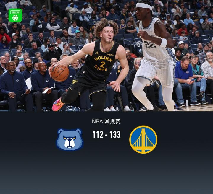 第四节,开节短暂拉锯之后,勇士佩顿、波杰姆斯基相继三分掀起一波16-6将分差拉大至30分以上,灰熊短暂反扑缩小分差,最终灰熊112-133不敌勇士。