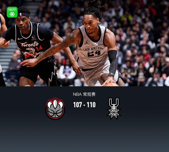 第四节,上来马刺延续三分手感,卡斯尔、瓦塞尔、巴恩斯相继三分,猛龙持续哑火没能回应,节中段马刺完成反超,后半节福克斯、文班亚马也相继三分命中领先6分,随后马刺接连进攻不中失误,猛龙抓住机会缩小至2分分差,比赛最后20秒,猛龙犯规战术,马刺哈珀、福克斯、文班亚马接连出现罚球不中,好在最后一攻猛龙英格拉姆绝平三分不中,最终猛龙107-110不敌马刺。