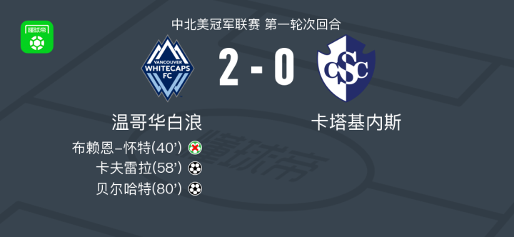 北京时间2月26日中北美冠军联赛 第一轮次回合,温哥华白浪对阵卡塔基内斯。温哥华白浪卡夫雷拉破门,贝尔哈特破门。最终比分温哥华白浪 2-0 卡塔基内斯。两回合总比分温哥华白浪2-0卡塔基内斯。