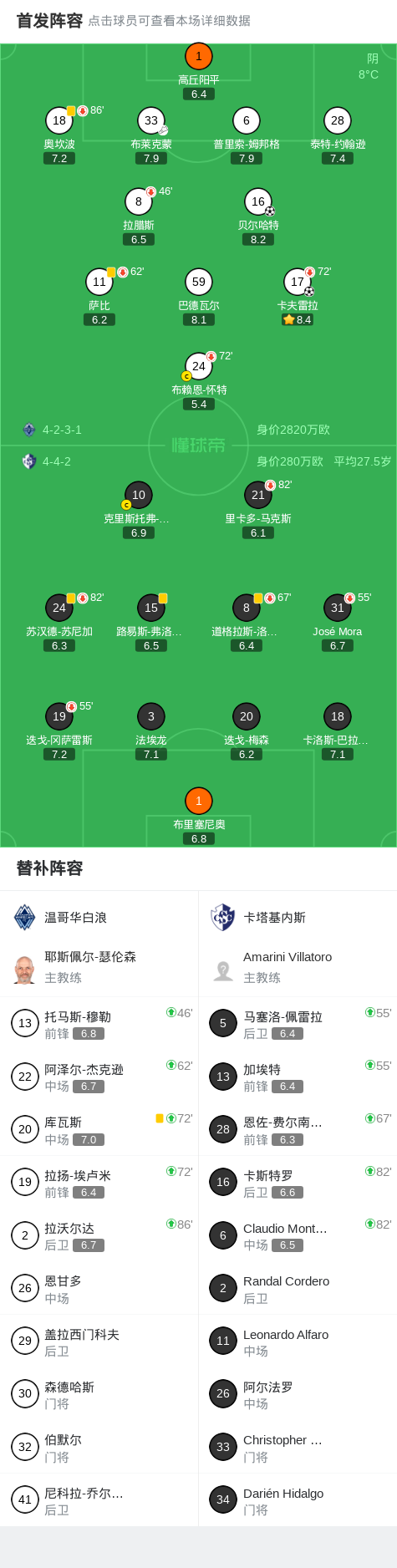 温哥华白浪2-0卡塔基内斯,卡夫雷拉破门,贝尔哈特锁定胜局