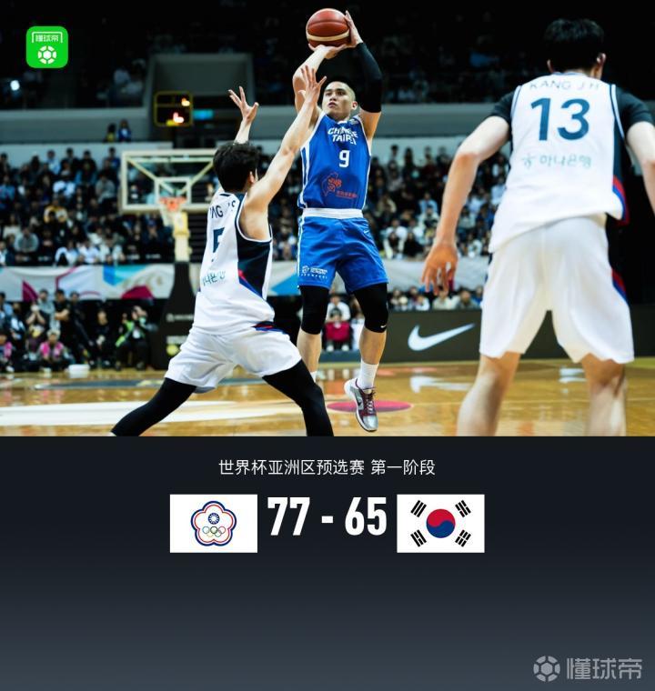 北京时间2月26日世界杯亚洲区预选赛 第一阶段,中国台北男篮对阵韩国男篮。半场中国台北男篮43-33韩国男篮,最终中国台北男篮77-65韩国男篮。