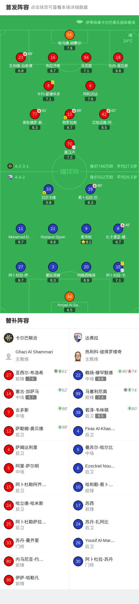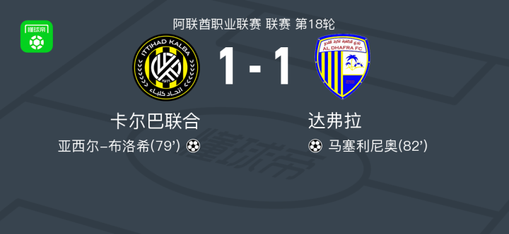 北京时间2月27日阿联酋职业联赛 联赛 第18轮,卡尔巴联合主场对阵达弗拉。卡尔巴联合亚西尔-布洛希破门。达弗拉马塞利尼奥破门。最终比分阿尔伊蒂哈德卡尔巴 1-1 达弗拉。