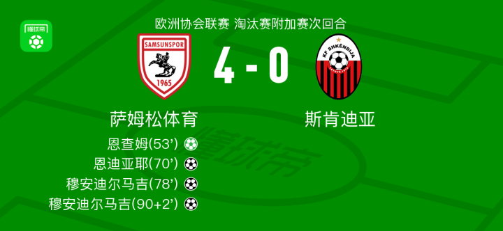 北京时间2月27日欧洲协会联赛 淘汰赛附加赛次回合,萨姆松体育对阵斯肯迪亚。萨姆松体育恩查姆破门,恩迪亚耶破门,穆安迪尔马吉梅开二度。最终比分萨姆松体育 4-0 斯肯迪亚。两回合总比分萨姆松体育5-0斯肯迪亚。