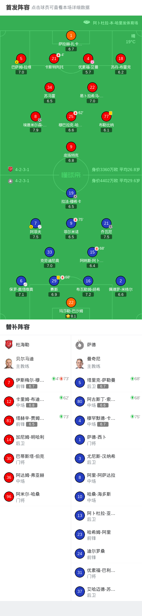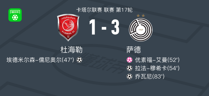北京时间2月27日卡塔尔联赛 联赛 第17轮,杜海勒主场对阵萨德。杜海勒埃德米尔森-儒尼奥尔破门,优素福-艾曼自摆乌龙。萨德拉法-穆希卡破门,乔瓦尼破门。最终比分杜海勒 1-3 萨德。