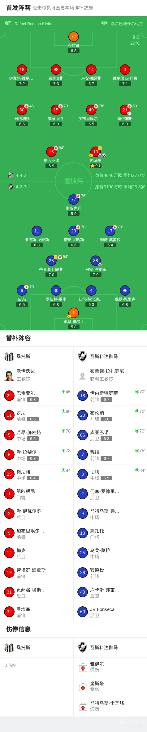 北京时间2月27日巴西足球甲级联赛 联赛 第4轮,桑托斯主场对阵瓦斯科达伽马。桑托斯内马尔梅开二度。瓦斯科达伽马考安-巴罗斯破门。最终比分桑托斯 2-1 瓦斯科达伽马。